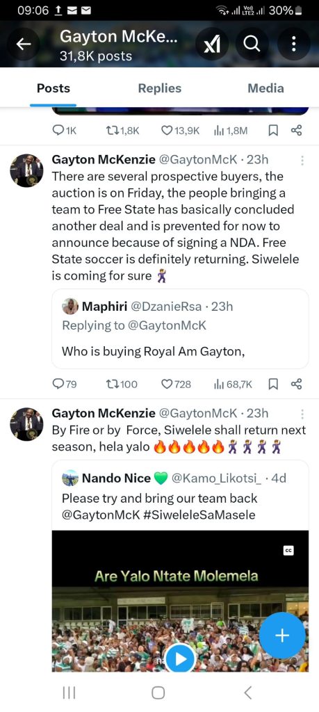 Without revealing much, the Minister for Sports, Arts, Culture and Recreation Mr Gayton McKenzie said on his X account there are a number of interested parties bidding for Royal AM, however, a deal has already been concluded and that Siwelele is definitely going to the Free State.