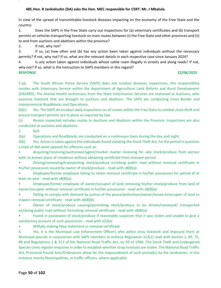 “In a reply to a question in the Free State Legislature, the MEC responsible for Community Safety, Roads and Transport indicated that movement and veterinary permits are requested from vehicles transporting livestock during roadblocks. Since January 2025, the SAPS have opened 460 cases involving livestock that range from, among others, lack of necessary permits, stock theft and false statements regarding permits.